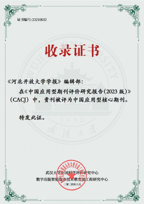 2024年8月31日,武漢大學中國科學評價研究中心、數字出版智能服務技術教育部工程研究中心聯合發布《中國應用型期刊評價研究報告(2023版)》,《河北開放大學學報》入選中國應用型核心期刊。
