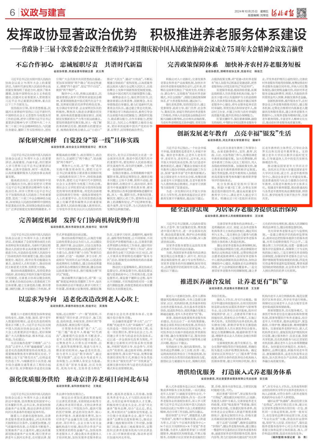 10月25日,河北日?qǐng)?bào)整版刊發(fā)了省政協(xié)十三屆十次常委會(huì)會(huì)議暨全省政協(xié)學(xué)習(xí)貫徹慶祝中國(guó)人民政治協(xié)商會(huì)議成立75周年大會(huì)精神會(huì)議上的發(fā)言摘登。我校黨委書記籍獻(xiàn)平在會(huì)議上就“發(fā)揮政協(xié)顯著政治優(yōu)勢(shì) 積極推進(jìn)養(yǎng)老服務(wù)體系建設(shè)”進(jìn)行發(fā)言。