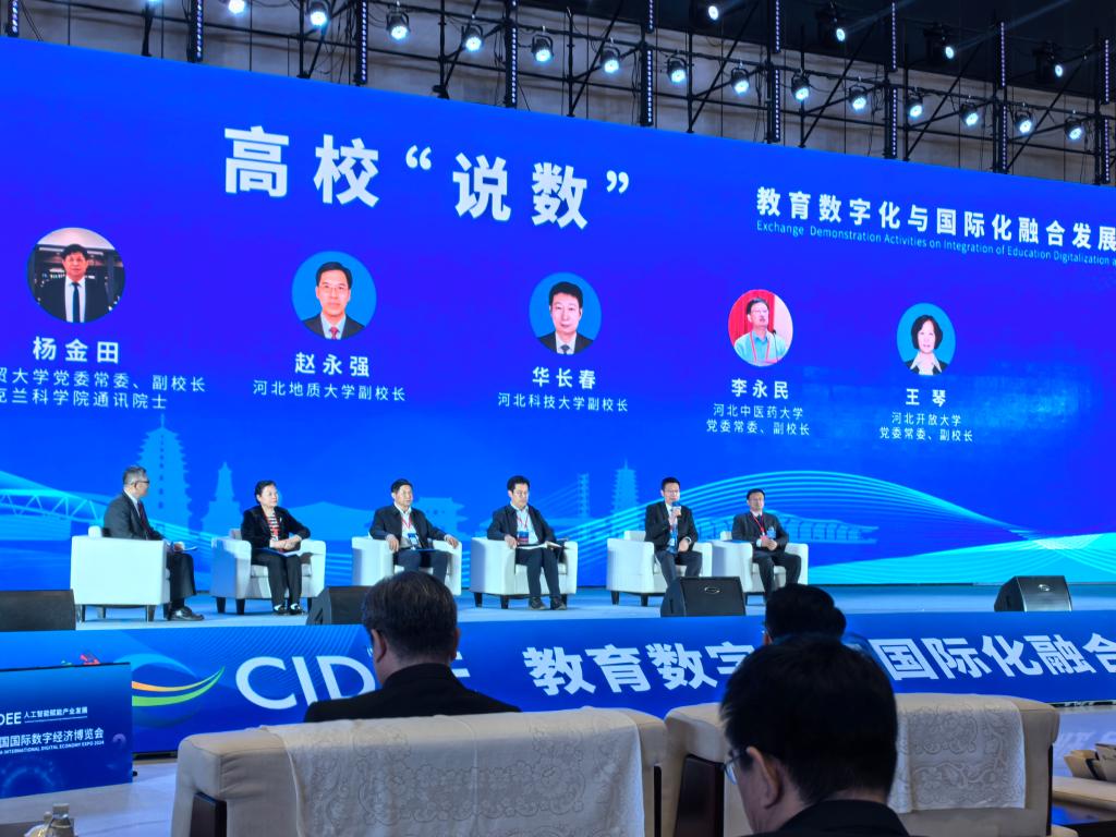 10月24日,2024中國國際數字經濟博覽會在石家莊(正定)國際會展中心舉行。河北開放大學黨委常委、副校長王琴應邀出席“教育數字化與國際化融合發展論壇”并參與圓桌對話,全省高校500余人參與此次活動。