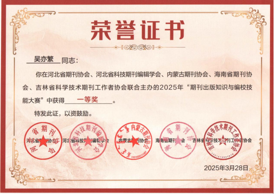 2025年3月28日,在河北省期刊協會、河北省科技期刊編輯學會、內蒙古期刊協會、海南省期刊協會、吉林省科學技術期刊工作者協會聯合主辦的2025年“期刊出版知識與編校技能大賽”中,《河北開放大學學報》編輯吳亦繁榮獲一等獎。