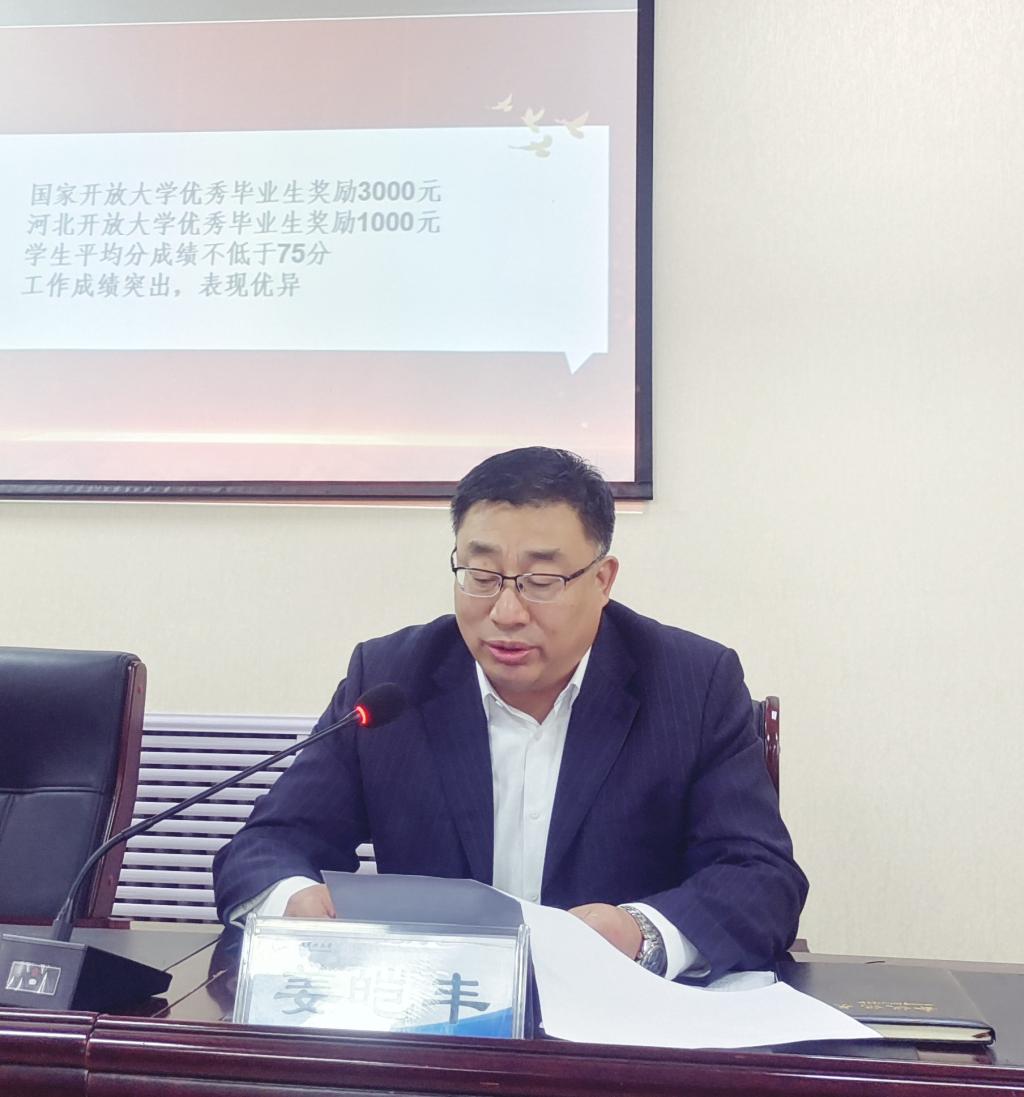 新生代表呂宏利同學講述了自己對開大處處能學、終身學習理念的理解,同時描述了對未來開大生活的展望,希望和同學們一起在承德開放大學這片知識的海洋里,揚起理想的風帆,互幫互助、共同進步,一起駛向成功的彼岸!