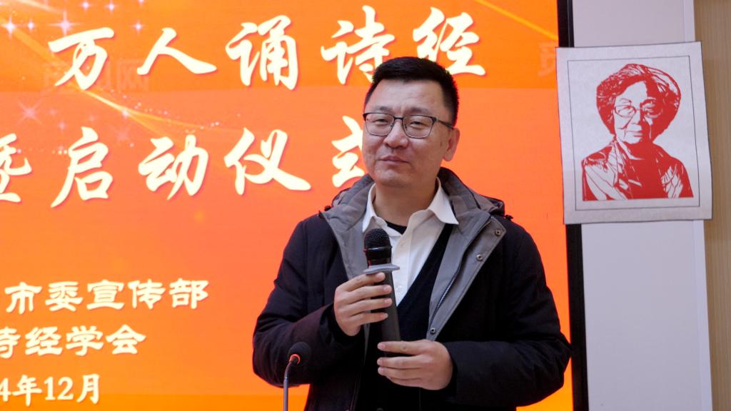 活動現場,滄州河間市委宣傳部常務副部長楊青松致辭。他表示,“百人講詩團 萬人誦詩經”這項活動旨在吸引更多的人來讀《詩經》、講《詩經》,培養更優質高效的《詩經》宣講隊伍,擴大《詩經》在河間的受眾群體。希望各位老師和學員認真研習《詩經》文本,掌握《詩經》典故,保持敬畏之心,深耕文本,涵通大義,筑牢基礎;樹立奮斗之志,真正把學與講貫穿始終,身體力行,篤行不怠;涵養團結之風,精誠團結,和衷共濟,形成合力。