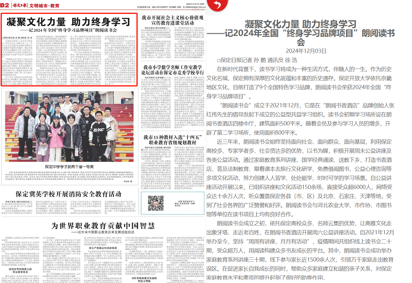 朗閱讀書會創始人張紅偉告訴記者:“打造文化保定是一個系統工程,需要政府、企業和社會各界的共同努力,保定開放大學就給予了我們師資支持并贈書。朗閱讀書會力求成為保定的一個文化品牌,通過讀書交流、網絡推廣、文化研學等多種渠道,提升保定文化品牌的知名度和美譽度,助力保定這座歷史文化名城煥發出新的生機與活力,成為連接過去與未來、傳統與現代的文化橋梁。我們一定在讀書這條路上堅定地一直走下去 !”