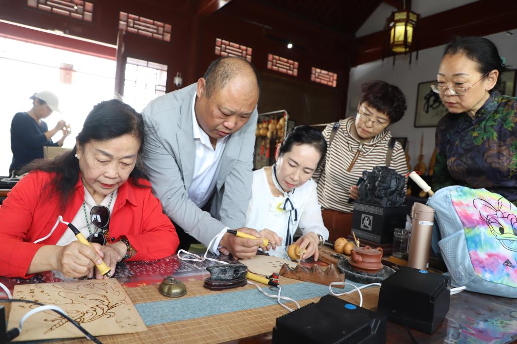 在活動(dòng)展區(qū),學(xué)員們一邊欣賞運(yùn)河美景,感受千年運(yùn)河的文化脈動(dòng),一邊體驗(yàn)雕版印刷姓氏圖騰、葫蘆烙刻姓名、手工香囊制作。參與學(xué)員張淑霞感慨:“原來我們的姓氏里藏著運(yùn)河的‘血脈’,這次活動(dòng)既長(zhǎng)了知識(shí),又找回了文化歸屬感?!?/p>