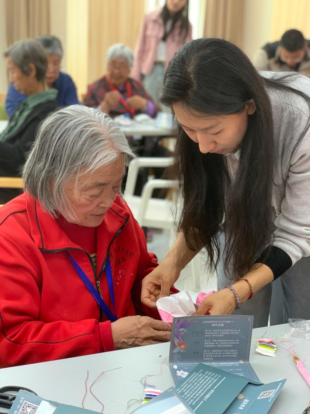 活動伊始,第一黨支部書記萬曉結合中醫藥文化,介紹了香囊的歷史淵源、文化寓意以及制作方法,老年朋友們聽得津津有味,沉浸在中華傳統文化的深厚魅力之中。制作環節,大家熱情高漲,紛紛動手實踐。支部黨員與團員采用“分組結對”的形式,幫助老人們穿針引線、縫制香包、填充香料、裝飾點綴,現場歡聲笑語不斷,其樂融融。