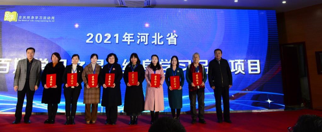 河北省教育廳二級巡視員、職成處(老年教育處)處長石建平宣讀了《河北省教育廳關(guān)于公布2021年河北省“百姓學(xué)習(xí)之星”和“終身學(xué)習(xí)品牌項目”的通知》,教育廳高教處處長彭繼東、省成協(xié)秘書長林志淼為獲獎代表頒獎。教育廳職成處(老年教育處)副處長邢文海宣讀《關(guān)于公布河北省社區(qū)教育老年教育系統(tǒng)慶祝建黨100周年主題活動評選結(jié)果的通知》,團省委丁玉立部長、省老齡辦張琳處長為獲獎?wù)叽眍C獎。