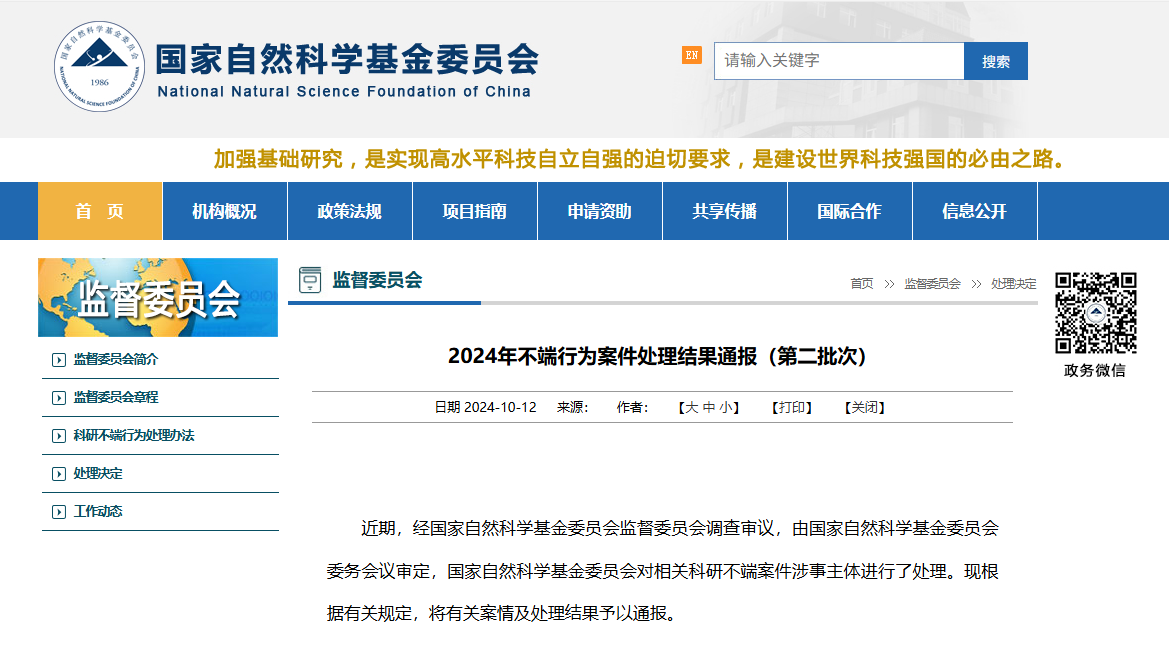(來源:2024年10月,國家自然科學基金委員會2024年不端行為案件處理結果通報)
